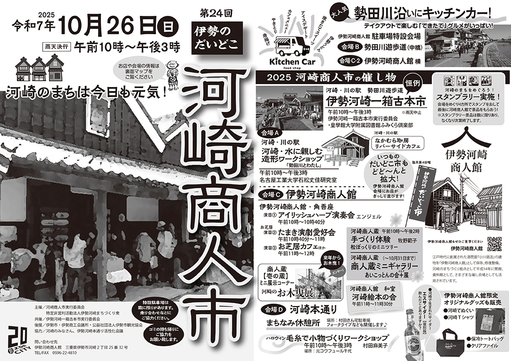 伊勢河崎商人館では「伊勢のだいどこ市」の出店やお芝居・アイリッシュハープの演奏・絵本の会・手づくり体験などがあります。